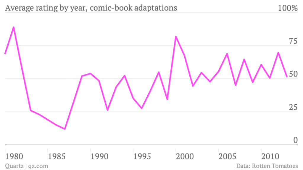 Quartz cerca anche di capire cosa ne pensa la critica di questa super-produzione di film di supereroi. Prendendo in esame i dati di Rotten Tomatoes (un sito che aggrega i giudizi dei critici cinematografici), viene fuori che la media dei voti ottenuti ogni anno dai vari film (in una scala da 0 a 100 per cento) non ha quasi mai superato il 70 per cento – con l’eccezione del 2002, quando uscì Spiderman che ottenne da solo l’89 per cento, alzando considerevolmente la media dell’anno. Si tratta di un segno – scrive Quartz – non necessariamente negativo, almeno per le case di produzione che sono riuscite a perfezionare uno stile abbastanza riconoscibile da attirare il grande pubblico, senza imbarcarsi in produzioni troppo originali o visionarie che potrebbero spaventarlo.