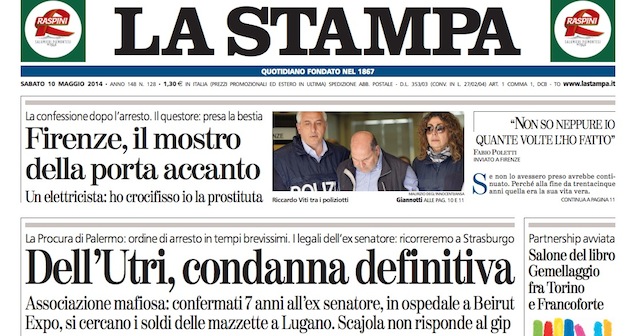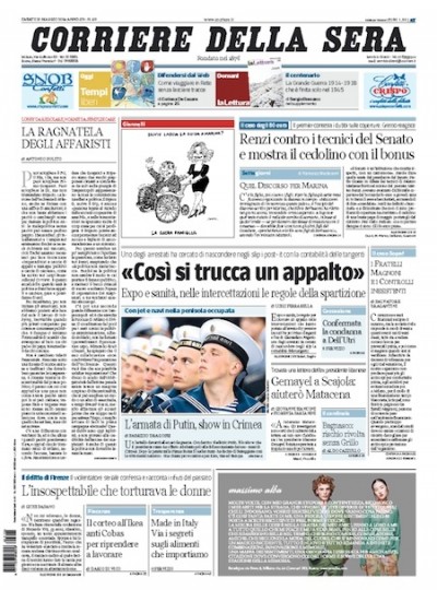 Alcuni dei principali quotidiani nazionali aprono con la conferma della condanna di Marcello Dell’Utri da parte della Cassazione, ma molto spazio è ancora dedicato agli arresti della guardia di finanza relativi all’Expo del 2015, l’Esposizione universale di Milano. Alcuni commentano anche lo “scontro istituzionale” tra il presidente del Consiglio Matteo Renzi e i tecnici del Senato riguardo alle coperture delle norme sull’Irap. Repubblica unisce nello stesso titolo l’arresto di Claudio Scajola e gli arresti dell’Expo del 2015. Sulla Gazzetta dello Sport l’apertura è dedicata al centrocampista e capitano dell’Inter, Javier Zanetti, che stasera giocherà la sua ultima partita da professionista allo stadio San Siro di Milano.