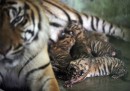 E un gruppo di caribù in Alaska, cuccioli di tigre di Sumatra e giraffe che si scambiano effusioni, tra le migliori foto di animali di questa settimana