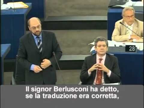 L’episodio a cui si riferisce Grillo (e che avevamo raccontato qui) risale al 2 luglio 2003, quando Silvio Berlusconi, allora presidente del Consiglio e presidente di turno dell’Unione Europea, disse che avrebbe suggerito Schulz a un suo amico regista che stava girando un film sui campi di concentramento nazista “per il ruolo di kapò”.