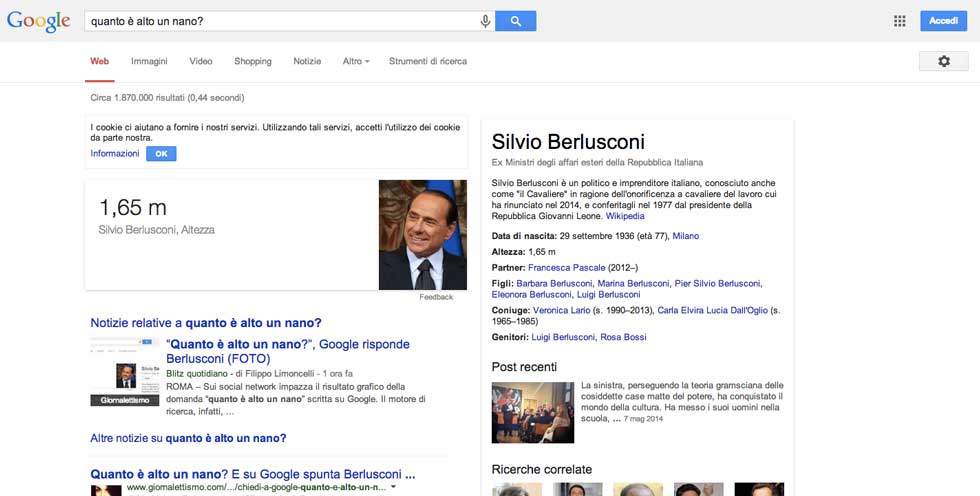 “Quanto è alto un nano?” è la domanda che in molti hanno provato a scrivere su Google da lunedì: non si capisce esattamente per quale ragione – forse quello che una volta si chiamava “google bombing”, la promozione di contenuti legati a una chiave di ricerca attraverso molti link sparsi per Internet – ma nel primo pomeriggio di lunedì cercando “quanto è alto un nano?” nella versione italiana di Google si otteneva questo. La schermata non appare a tutti gli utenti (e probabilmente a un certo punto sarà rimossa del tutto).