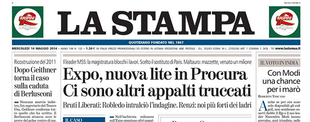 Tre notizie principali si dividono lo spazio sulla gran parte delle prime pagine dei giornali di oggi: la presenza contemporanea di Beppe Grillo e Matteo Renzi a Milano, per parlare soprattutto di Expo 2015, l’esposizione universale che si terrà proprio a Milano tra un anno; le novità sulle inchieste riguardo la stessa Expo 2015; la lista dei 30 calciatori pre-convocati dalla Nazionale italiana di calcio in vista dei Mondiali in Brasile.