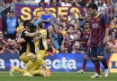 La partita dell’Atletico Madrid non si era messa troppo bene nel primo tempo: dopo pochi minuti di gioco si sono infortunati Diego Costa, uno degli attaccanti più in forma di tutto in campionato e incluso nella lista dei preconvocati della Nazionale spagnola ai Mondiali in Brasile, e Arda Turan, ala della Nazionale turca. Entrambi sono stati sostituiti. Poi è arrivato per il Barcellona il bel gol all’incrocio di Sanchez, ex giocatore dell’Udinese (Sanchez e Simeone – l’allenatore dell’Atletico Madrid – hanno vinto nel 2008 il campionato argentino insieme, al River Plate). La gara è cambiata nel secondo tempo, con il pareggio di testa del difensore uruguaiano con passaporto spagnolo Diego Godín.