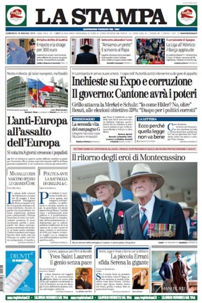 I principali quotidiani di oggi non trattano tutti la stessa notizia in apertura: Stampa e Repubblica si occupano ancora dell’inchiesta sugli appalti per la realizzazione dell’Expo di Milano e riportano che il commissario anticorruzione Raffaele Cantone avrà maggiori poteri. Il Corriere, come anche altri giornali, riporta invece del comizio di Beppe Grillo, leader del Movimento 5 Stelle, a Torino. I giornali sportivi si occupano principalmente della bella vittoria della tennista italiana Sara Errani nella semifinale degli Internazionali BNL di Roma e della vittoria del campionato spagnolo da parte dell’Atletico Madrid.