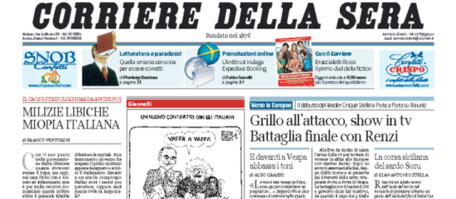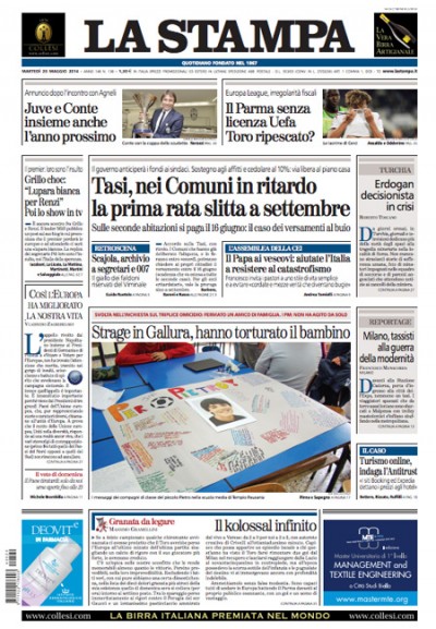 Anche oggi la maggior parte dei giornali apre con la campagna elettorale per le elezioni europee e con gli attacchi di Grillo, che ieri sera è stato intervistato a Porta a Porta da Bruno Vespa, e di Renzi, che ha accusato Grillo di rappresentare solo una politica di insulti e demagogia. Chi decide di non occuparsi di questo apre invece sullo slittamento a settembre del pagamento della TASI per i comuni che non hanno ancora deliberato l’aliquota da pagare. I quotidiani sportivi titolano sulla conferma di Antonio Conte come allenatore della Juventus anche per il prossimo anno, dando giudizi opposti sulla scelta giocando con il suo cognome.