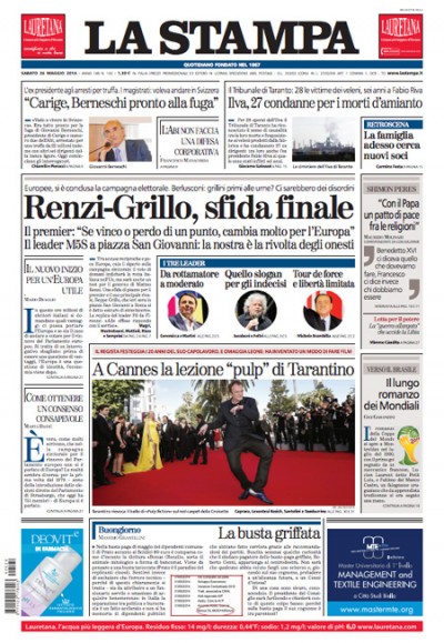 Tutti i giornali di oggi aprono sui comizi di chiusura della campagna elettorale per le elezioni europee dei leader dei principali partiti, e le parole più usate per descrivere il risultato delle elezioni di domani sono “partita finale”, “sfida finale” fra Renzi e Grillo, mentre la campagna elettorale viene descritta come una campagna in cui hanno dominato gli insulti fra i vari leader. I quotidiani sportivi presentano la finale di stasera della Champions League, con il derby a Lisbona fra Atletico e Real Madrid.