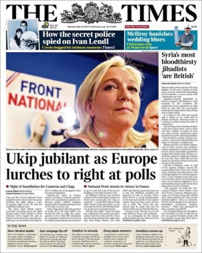 Le prime pagine dei principali quotidiani d’Europa pubblicati lunedì 26 maggio sono quasi interamente dedicate ai risultati delle elezioni europee che si sono svolte nei giorni precedenti. I giornali francesi commentano la vittoria notevole del Front National guidato da Marine Le Pen, in vantaggio sull’UMP e sui socialisti del presidente Francois Hollande. Nel Regno Unito è andato forte l’UKIP, il partito di estrema destra di Nigel Farage, in vantaggio sui conservatori di Cameron e sul partito laburista.