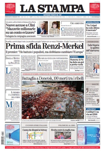 La maggior parte dei giornali di oggi apre sul vertice di Bruxelles dei leader dei paesi dell’Unione Europea, in cui si è parlato delle nomine per la Commissione e Matteo Renzi ha chiesto un cambiamento delle politiche di austerità. Il Corriere della Sera e il Manifesto si occupano invece dei violenti scontri in Ucraina fra l’esercito e i ribelli filo russi, il Giornale torna sul “complotto” per far cadere Berlusconi, sul quale starebbe indagando la procura di Roma, e Libero e il Tempo seguono la crisi elettorale e le possibili soluzioni per il rilancio del centro destra.