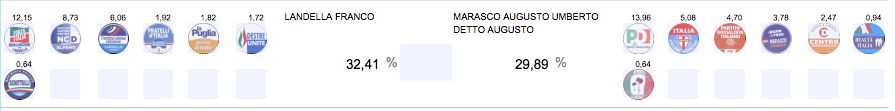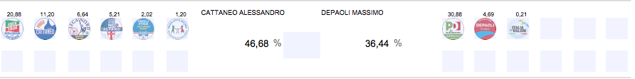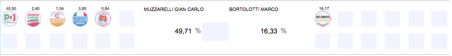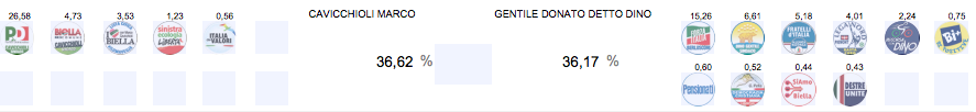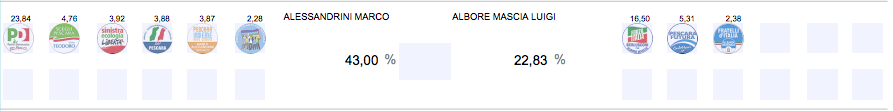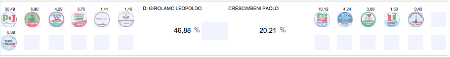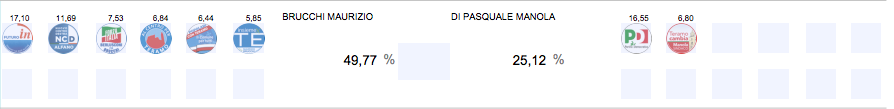 Il candidato di centrodestra, Maurizio Brucchi, per pochissimo non è riuscito a vincere al primo turno contro la candidata di centrosinistra, Manola Di Pasquale, che intanto ha ottenuto l’apooggio esterno (ma non l’apparentamento) di tre liste civiche.