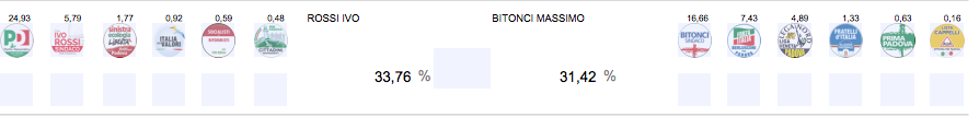 Ivo Rossi del centrosinistra è in vantaggio di poco più di due punti su Massimo Bitonci del centrodestra. Entrambi, per il secondo turno, hanno ottenuto l’appoggio di due candidati che hanno perso al primo turno: Francesco Fiore (9,91 per cento dei voti) e Andrea Colasio (assessore uscente alla Cultura, sostenuto da Scelta Civica che ha ottenuto il 2,43 per cento) saranno con Ivo Rossi; Maurizio Saia (ex assessore alla Sicurezza ed ex parlamentare, candidato del centrodestra sostenuto anche da NCD-UdC che ha preso il 10,63 per cento) e Alberto Salmaso (1,14) saranno con Massimo Bitonci. Non hanno fatto accordi, invece, Rifondazione Comunista, Movimento 5 Stelle e la lista civica Padova Sociale di Bruno Cesaro.