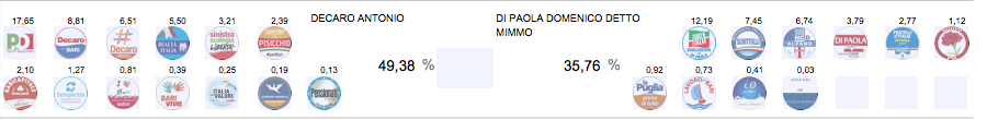 Il candidato del centrodestra Domenico Di Paola, che è anche l’ex amministratore unico di Aeroporti di Puglia, durante la conferenza stampa per commentare i risultati ha accusato i giornalisti di averlo fatto perdere al primo turno con “editoriali di parte” favorevoli ad Antonio Decaro, parlamentare del PD e candidato del centrosinistra scelto con le primarie. Nonostante il vantaggio notevole di Decaro, 15 punti, il sindaco uscente Michele Emiliano ha invitato a lottare «con il coltello tra i denti fino all’ultimo minuto» per confermare i voti presi il 25 maggio. Di Paola sta invece puntando a portare al voto soprattutto gli astenuti del primo turno: il 67 per cento degli aventi diritto. Ci sono poi i voti presi dagli altri otto candidati al primo turno (15 per cento) che però non daranno ufficialmente il loro appoggio né a Decaro né a Di Paola.