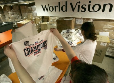 La NFL stampa in anticipo maglie e cappellini celebrativi per entrambe le squadre che giocano la finale. I negozi di abbigliamento sportivo delle città delle due squadre ordinano i pezzi in anticipo. […] Quando il materiale è pronto, viene spedito al centro di distribuzione del rivenditore, che lo manda ai singoli negozi che lo conservano nei propri magazzini fino alla fine della partita: subito dopo espongono negli scaffali il merchandising della squadra vincente. Qui subentra World Vision. Tutto il materiale della squadra che ha perso viene rispedito al centro di distribuzione, conteggiato e donato a noi: il tutto arriva nel nostro centro di distribuzione a Pittsburgh, in Pennsylvania, dove viene nuovamente conteggiato e diviso per taglia, genere e destinazione – significa che una maglietta a maniche corte potrebbe essere spedita a un paese con un clima caldo, mentre una felpa a un paese come la Mongolia, dove fa freddo.