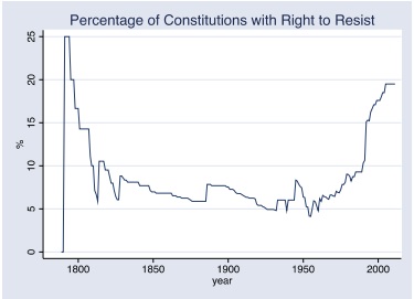 Gli autori dello studio notano come l’introduzione del diritto alla rivolta arrivi in genere dopo una qualche genere di ribellione contro l’ordine costituito o comunque dopo un evento particolarmente tragico. In Francia il diritto a resistere all’oppressione esiste dai tempi della Rivoluzione francese ed è sopravvissuto fino ad oggi. In Germania venne introdotto per la prima volta nella Costituzione della Germania occidentale, dopo la sconfitta del nazismo, ed è rimasto nella nuova Costituzione unitaria. Il diritto alla rivolta del Ruanda venne inserito nella Costituzione dopo il genocidio del 1994 e prevede il diritto a ribellarsi agli ordini dei propri superiori quando questi rappresentano una manifesta violazione dei diritti umani.