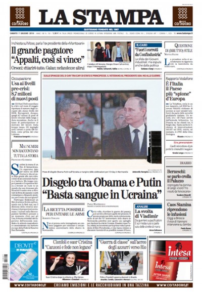 Oggi non c’è una notizia unica in apertura sui quotidiani: alcuni si occupano dell’incontro, in occasione delle celebrazioni per il settantesimo anniversario dello sbarco in Normandia, fra Obama e Putin, che avrebbe aperto uno spiraglio di speranza per un accordo sull’Ucraina, altri aprono sui primi interrogatori degli arrestati nell’inchiesta veneziana sulle tangenti per la costruzione del MOSE, mentre il Messaggero titola sulla decisione di Standard & Poor’s di confermare il rating per l’Italia e il Manifesto segue lo sciopero di ieri dei dipendenti comunali romani.