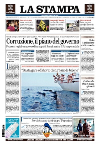 I principali quotidiani nazionali non hanno un’unica notizia in prima pagina, ma molti aprono ancora con approfondimenti riguardo l’inchiesta veneziana sulle tangenti per la costruzione del MOSE. Repubblica ha un titolo che fa riferimento a questa vicenda – “Renzi: via a calci i ladri dal PD” – e che riprende e sintetizza l’opinione espressa sabato dal Presidente del Consiglio Matteo Renzi al teatro San Carlo di Napoli, nel corso di un’intervista con il direttore Ezio Mauro, nell’ultimo giorno della serie di incontri “La Repubblica delle idee”. Anche la Stampa e il Corriere trattano questo intervento di Renzi, dedicando ulteriori approfondimenti ai prossimi provvedimenti del governo per contrastare la corruzione.