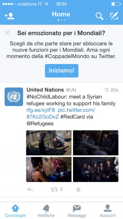 La modifica più evidente interessa le applicazioni per smartphone di Twitter. Un recente aggiornamento ha portato una serie di opzioni per indicare la nazionale per la quale si fa il tifo, trovare utenti che parlano dei Mondiali utili da seguire e per coinvolgere di più i propri amici e follower. Per impostare l’applicazione basta seguire una serie di passaggi che vi spieghiamo qui sotto, per immagini.