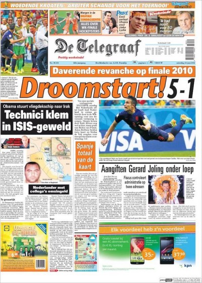 Venerdì sera l’Olanda ha battuto 5-1 la Spagna campione del mondo nella prima partita del girone B dei Mondiali di calcio. Un risultato molto netto e inaspettato: e la differenza di umore tra spagnoli e olandesi è ben rappresentata dalle prime pagine dei loro giornali di sabato mattina.