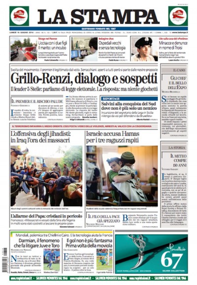 La maggior parte dei giornali di oggi sceglie di occuparsi in apertura della proposta avanzata ieri da Grillo e Casaleggio con un intervento sul blog di incontrare Matteo Renzi per discutere di legge elettorale e riforme, e della risposta di Renzi, che chiede che l’eventuale incontro sia trasmesso in streaming per evitare “giochini”. Il Corriere della Sera fa invece un bilancio dei primi mesi di attività del governo, il Messaggero annuncia tagli al numero degli uffici pubblici, e l’Unità presenta il testo sulle unioni omosessuali che il governo dovrebbe approvare dopo l’estate.