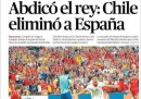 I giornali di oggi in Cile sono comprensibilmente su di giri, dopo la vittoria sui campioni del mondo della Spagna che ha determinato – oltre alla gloria, semplicemente – la qualificazione matematica del Cile agli ottavi di finale dei Mondiali di calcio e la clamorosa eliminazione della stessa Spagna. La gran parte dei titoli fa notare la portata “storica” di quanto accaduto e insiste sul fatto che la nazionale cilena è l’unica vera “roja”, rivendicando come proprio il nome con cui ci si riferisce da sempre alla nazionale cilena e solo da qualche anno anche alla nazionale spagnola. Le prime pagine spagnole erano ben più tristi, e si capisce.