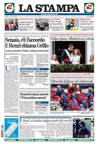 Non c’è una notizia unica in apertura sui giornali di oggi: alcuni aprono sul cammino delle riforme, che sembra aver avuto un’accelerazione negli ultimi giorni, e sull’incontro fra il Presidente del Consiglio Renzi e il leader del M5S Grillo fissato per mercoledì prossimo, altri seguono ancora la vicenda di Yara Gambirasio e avanzano qualche dubbio sulla colpevolezza del fermato, dopo che il GIP ieri non ne ha convalidato il fermo ma lo ha lasciato in carcere. Il Manifesto e Europa si occupano delle divisioni interne a SEL, a rischio di scissione dopo il voto favorevole sul decreto sugli 80 euro, e i giornali sportivi, ma la notizia è presente su quasi tutte le prime pagine, presentano la partita di stasera dell’Italia contro il Costa Rica ai mondiali in Brasile.