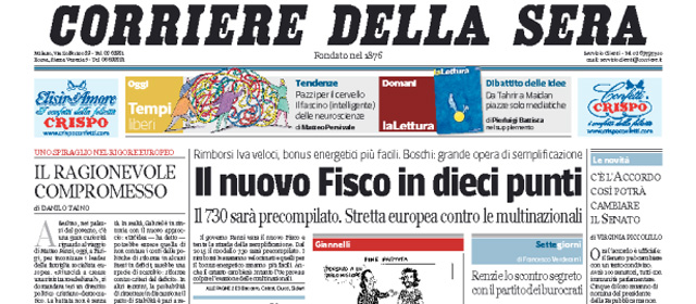 Tutti i quotidiani di oggi, sportivi e non, dedicano molto spazio sulle prime pagine alla sconfitta con il Costa Rica dell’Italia, che ora è costretta almeno a pareggiare con l’Uruguay per passare il turno ai mondiali in Brasile: il giudizio sull’Italia è diviso fra chi sottolinea la pessima partita di ieri e chi invece vede il bicchiere mezzo pieno della qualificazione a portata di mano. Oltre a questa, le notizie principali sono due: l’accordo che sembra sia stato finalmente raggiunto sulla riforma del Senato, e la riforma del fisco presentata ieri nel consiglio dei ministri, della quale il punto principale per i giornali è l’invio a casa dei contribuenti del modello 730 precompilato a partire dal prossimo anno.