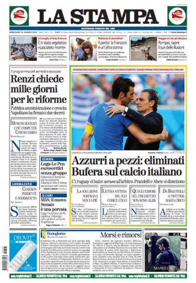 Per tutti i giornali di oggi la notizia di apertura è l’eliminazione dell’Italia dai mondiali in Brasile dopo la sconfitta con l’Uruguay e le conseguenti dimissioni di Prandelli e Abete: le parole usate per definire il cammino dell’Italia sono “disastro”, “sfascio”, “disfatta”, “fallimento”, fino all’eloquente titolo del Tempo “che pippe”, mentre tre giornali diversi titolano i loro editoriali “morsi e rimorsi”, commentando il morso dato da Suarez a Chiellini. L’unica notizia che ruba un po’ di spazio alle aperture sull’Italia è il discorso alla Camera del Presidente del Consiglio Renzi, che ha illustrato il programma del governo per i prossimi mille giorni, mentre il Giornale celebra oggi i 40 anni di uscita.