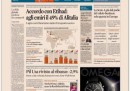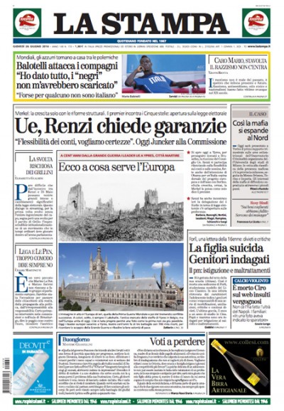 Ci sono molte notizie diverse in apertura sui giornali di oggi: la riunione del Consiglio europeo di oggi e domani, dal quale ci si aspettano novità sulle modifiche al patto di stabilità, l’incontro di ieri fra il PD e il M5S sulla legge elettorale, con l’apertura di Renzi alla richiesta di reintrodurre le preferenze, l’intervento del governo sulla giustizia, all’esame del consiglio dei ministri di lunedì, la morte di Ciro Esposito, il tifoso napoletano ferito durante gli scontri a Roma prima della finale di coppa Italia, il messaggio di Balotelli su Instagram, nel quale risponde alle critiche ricevute dopo l’eliminazione dell’Italia ai mondiali in Brasile, e l’ufficialità dell’accordo fra Alitalia e Etihad.