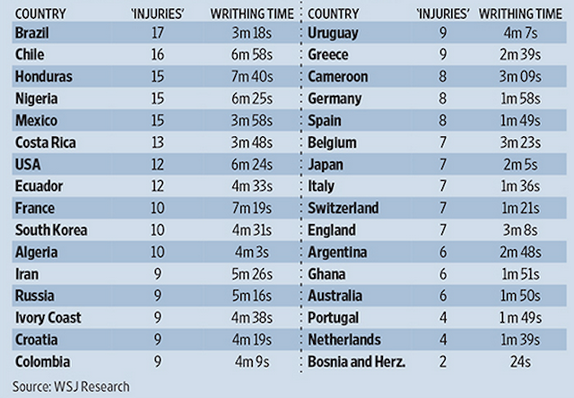 Secondo i calcoli, le squadre che erano in vantaggio – e che quindi erano più interessate a perdere tempo – hanno passato il quadruplo del tempo a fingere infortuni rispetto quelle in svantaggio: il caso più notevole è quello del Cile, che durante la partita con la Spagna vinta per 2-0 difese il vantaggio anche grazie a 11 episodi di questo tipo. La squadra prima in classifica, comunque, è il Brasile: ha totalizzato 17 finti infortuni (cinque dei quali accaduti al solo Neymar).