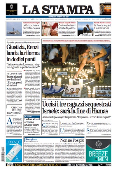 I giornali di oggi si dividono le aperture fra tre notizie diverse: il ritrovamento dei cadaveri dei tre ragazzi israeliani rapiti vicino a Hebron e le minacce del governo israeliano a Hamas, accusato di essere responsabile della loro uccisione, la nuova strage dell’immigrazione nel canale di Sicilia, dove trenta migranti sono morti asfissiati in un barcone che ne conteneva più di seicento, e la riforma della giustizia annunciata ieri sera dal Presidente del Consiglio Renzi dopo la riunione del consiglio dei ministri.