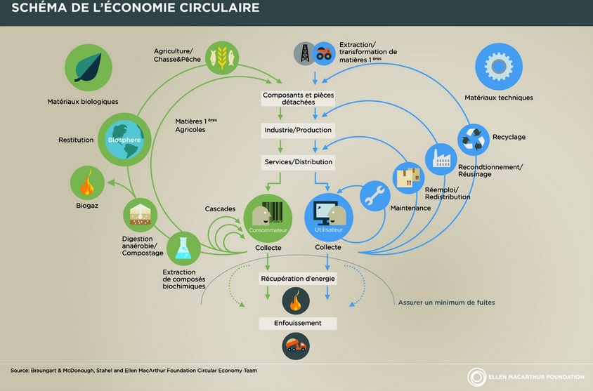L’economia circolare, secondo la definizione che ne dà la Ellen MacArthur Foundation, «è un termine generico per definire un’economia pensata per potersi rigenerare da sola. In un’economia circolare i flussi di materiali sono di due tipi: quelli biologici, in grado di essere reintegrati nella biosfera, e quelli tecnici, destinati ad essere rivalorizzati senza entrare nella biosfera». L’economia circolare è dunque un sistema in cui tutte le attività, a partire dall’estrazione e dalla produzione, sono organizzate in modo che i rifiuti di qualcuno diventino risorse per qualcun altro. Nell’economia lineare, invece, terminato il consumo termina anche il ciclo del prodotto che diventa rifiuto, costringendo la catena economica a riprendere continuamente lo stesso schema: estrazione, produzione, consumo, smaltimento.