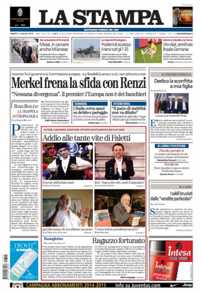 La maggior parte dei giornali di oggi dedica l’apertura ancora al rapporto fra Italia e Germania sulle politiche economiche europee che, dopo le polemiche dei giorni scorsi fra il Presidente del Consiglio Renzi e il presidente della Bundesbank, sembra giungere a un momento di maggiore tranquillità fra Merkel e Renzi. Repubblica titola invece sulle divisioni nel PD sul cammino delle riforme, il Manifesto apre sulla decisione degli Stati Uniti di bloccare i voli degli F35 per motivi di sicurezza, e il Fatto si occupa dell’arresto di Milanese nell’inchiesta sul MOSE. I quotidiani sportivi commentano le vittorie contro Colombia e Francia di Brasile e Germania, che si incontreranno martedì in semifinale ai mondiali in Brasile.