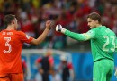 Tim Krul ha 26 anni, è alto 1 metro e 93 e gioca nel campionato inglese con il Newcastle da diverse stagioni. È un buon portiere, anche se non è considerato un fenomeno e non è propriamente quello che si definisce solitamente un “pararigori”: in carriera ne ha parati due su venti, che non sono molti (ha fatto comunque meglio di Cillessen, che non ne ha mai parato neanche uno). Proprio per questo motivo i molti che hanno commentato la partita di ieri sera hanno apprezzato e lodato ancora di più la scelta di van Gaal, al quale è stato da molti attribuito il merito di aver tolto tensione ai rigoristi dell’Olanda caricandosi una certa responsabilità sulle spalle: se Krul non ne avesse parato neanche uno, scrive SkySport, e l’Olanda fosse eventualmente uscita per l’errore di un rigorista, l’errore del rigorista sarebbe stato probabilmente meno biasimato rispetto alla scelta dell’allenatore di cambiare portiere all’ultimo.
