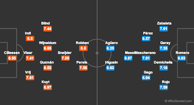 Nella partita di stasera, poi, giocheranno contro due fra i giocatori più in forma dei Mondiali in corso: Arjen Robben e Lionel Messi. Robben ha segnato tre gol ed è stato fra i migliori in campo praticamente in ogni partita: contro il Messico, agli ottavi di finale, il rigore che ha permesso all’Olanda di passare è arrivato per un fallo di Rafael Márquez dopo una sua grande azione solitaria – anche se secondo molti ha esagerato nella caduta. Messi, invece, ha tirato fuori l’Argentina da partite complicate (ha segnato quattro gol nella fase a gironi, sui sette totali della squadra), e in generale è sembrato molto più a suo agio rispetto agli anni scorsi. L’allenatore dell’Argentina Alejandro Sabella, dopo i quarti di finale vinti col Belgio, ha detto che durante la partita aveva prodotto «una brezza di aria fresca quando attorno il terreno era secco».