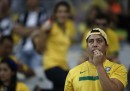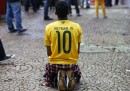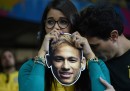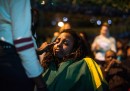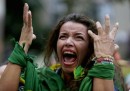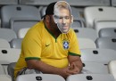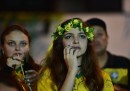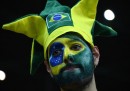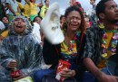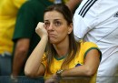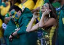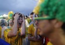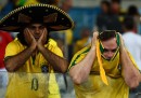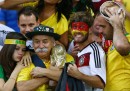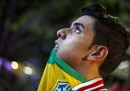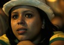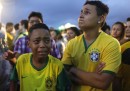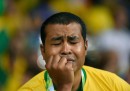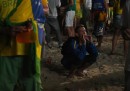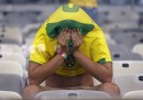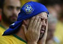 Nessun tifoso di calcio vorrebbe trovarsi nei panni di quelli del Brasile, che ieri hanno subìto – in casa, nel “loro” Mondiale – quella che i giornali brasiliani hanno definito “la peggior sconfitta calcistica della storia del paese”. La Germania ha schiantato il Brasile 7-1: già dopo i primi tre gol le facce dei tifosi avevano un’espressione preoccupata e incredula, che col passare dei minuti e l’aumentare dei gol si è trasformata in sconforto, tristezza e, in alcuni casi, disperazione: bambini che piangono, ragazze coi lacrimoni, un ragazzo con la maglietta di Neymar seduto mestamente a terra e un povero signore abbracciato a una finta Coppa del mondo, mentre un tifoso tedesco esulta felice e spietato accanto a lui.