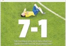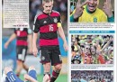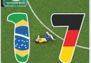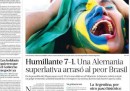 Le prime pagine dei giornali di buona parte del mondo sono dedicate alla sconfitta senza precedenti del Brasile contro la Germania, che ha vinto 7 a 1 la prima semifinale dei Mondiali di calcio, ieri a Belo Horizonte. Quasi tutti i giornali brasiliani hanno la parola “vergogna” nei loro titoli, con articoli molto pesanti nei confronti dei giocatori e del loro allenatore Luiz Felipe Scolari. Tra i più severi c’è il Correio Braziliense che titola il suo editoriale “Una vergogna per l’eternità”. Anche i giornali di altri paesi sudamericani sono molto severi, e in alcuni casi malcelano una certa soddisfazione per la sconfitta del Brasile. La parola più ricorrente sulle prime pagine dei giornali non brasiliani è invece “umiliazione” e si dà conto della sconfitta, raccontando dell’incredibile serie di gol segnati dalla Germania in una manciata di minuti durante il primo tempo della partita. Le fotografie mostrano soprattutto giocatori brasiliani delusi e facce molto tristi dei tifosi.