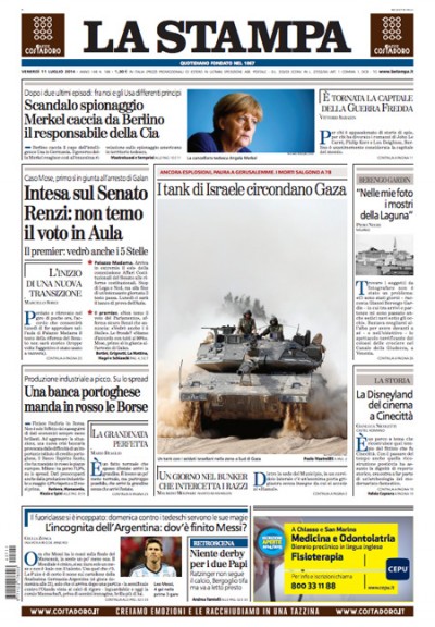 Per molti giornali l’apertura di oggi è sull’approvazione da parte della commissione affari costituzionali del Senato della riforma del Senato, che lunedì dovrebbe cominciare l’esame in aula. Il Corriere della Sera, il Manifesto e l’Osservatore Romano titolano invece sulla guerra a Gaza, dove si teme l’invasione da parte dei carri armati israeliani, mentre il Secolo XIX si occupa della decisione del governo tedesco di espellere il capo della CIA per le attività di spionaggio in Germania della NSA, e il Messaggero apre sulla seconda parte del piano per riformare la pubblica amministrazione, approvato ieri dal governo.