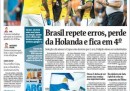 Sabato 12 luglio si è giocata allo stadio “Nacional” di Brasilia la finale per il terzo e quarto posto dei Mondiali di calcio. Il Brasile ha perso – molto male – contro l’Olanda, prendendo due gol nei primi venti minuti e il terzo gol nel recupero del secondo tempo. La nazionale brasiliana arrivava da una durissima e umiliante sconfitta per 7-1 nella semifinale giocata contro la Germania, e in molti si aspettavano una specie di riscatto. Che non c’è stato. Il Brasile ha giocato male, è sembrato senza idee e senza gioco. La stampa brasiliana – come del resto quella di tutto il mondo – ha dato la maggior parte delle colpe all’allenatore Felipe Scolari: le prime pagine brasiliane del giorno dopo la fine del Mondiali per il Brasile sono piene di giocatori con la testa fra le mani, tifosi disperati e molta “amarezza” e “malinconia”.