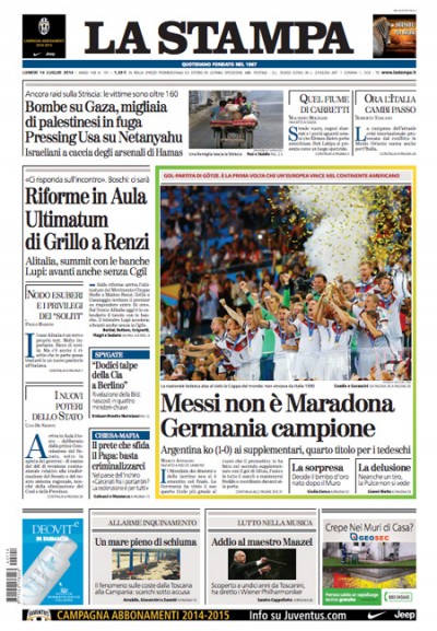 Sono due le notizie che si dividono l’apertura dei giornali di oggi: la situazione a Gaza, dove ieri ci sono stati i primi attacchi di terra e prosegue la fuga dei civili dalle zone bombardate, mentre per ora falliscono i primi tentativi di mediazione da parte degli Stati Uniti e dell’ONU, e la vittoria della Germania sull’Argentina con un gol ai tempi supplementari nella finale dei mondiali in Brasile. Il Messaggero fa una scelta diversa, occupandosi delle possibili modifiche alla legge per il nuovo senato per togliere l’immunità ai senatori.