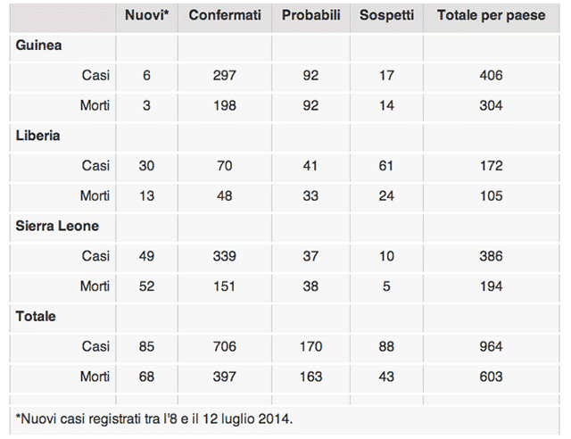 In tutto, le morti fino a ora attribuibili a infezioni da virus Ebola da marzo in Guinea, Liberia e Sierra Leone sono 603, mentre le persone infette sono state almeno 964. In Guinea è stato registrato il numero più alto di casi: 409 con 304 morti. I dati comprendono casi accertati confermati e morti sospette, che secondo i responsabili dell’OMS possono essere riconducibili a una infezione da Ebola, anche se in assenza di conferme definitive.