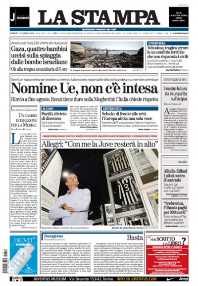 Le notizie che si dividono l’apertura sulle prime pagine dei giornali di oggi sono due: il mancato accordo sulle nomine dei nuovi vertici dell’Unione Europea e soprattutto sul nome di Mogherini, candidata a Alto rappresentante per la politica estera, mentre torna a circolare il nome di Enrico Letta, e gli attacchi israeliani a Gaza, dove ieri una bomba ha provocato la morte di quattro bambini su una spiaggia. I quotidiani sportivi titolano sulla decisione della Juventus di prendere Allegri come nuovo allenatore dopo le dimissioni di Antonio Conte.