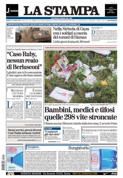 I quotidiani di oggi aprono tutti con la notizia dell’assoluzione di Silvio Berlusconi nel processo d’appello per il caso Ruby, vicenda per la quale era stato condannato in primo grado a sette anni, e analizzano le possibili conseguenze della sua assoluzione sulla vita politica italiana. Le altre notizie che occupano molto spazio sulle prime pagine sono le indagini sull’aereo della Malaysia Airlines abbattuto giovedì sul cielo dell’Ucraina, per il quale le accuse sembrano convergere sui ribelli filo russi, e la situazione a Gaza al secondo giorno dell’invasione via terra da parte delle truppe israeliane.