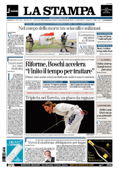 Gran parte dei quotidiani pubblica in apertura un pezzo sulle conseguenze politiche dell’assoluzione di Silvio Berlusconi dalla condanna in primo grado per concussione e prostituzione minorile nel processo Ruby. Il Tempo e il Manifesto, seppure con approcci diversi, scelgono invece di aprire con la morte di alcuni migranti al largo di Lampedusa. Altrove, si parla ancora molto della guerra in corso fra Israele e Palestina e delle vicende dei passeggeri del volo MH17, precipitato in Ucraina. I giornali sportivi, come da periodo, si occupano parecchio di calciomercato.