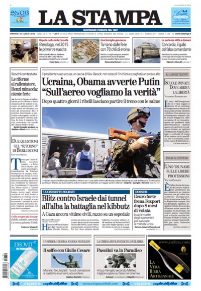 I quotidiani principali oggi si dividono nella scelta dell’apertura fra tre notizie diverse: le indagini e le diverse ipotesi sull’abbattimento del volo della Malaysia Airlines in Ucraina e l’intervento di Obama a sollecitare la collaborazione delle autorità russe, la guerra a Gaza, dove ieri è stato colpito da un missile un ospedale, e l’inizio della discussione in aula al Senato sulla riforma che dovrebbe rendere il Senato non elettivo, difesa dal ministro Boschi che ha criticato chi aveva definito illiberale il disegno di legge e ha ricevuto per questo la contestazione di Movimento 5 Stelle e SEL.