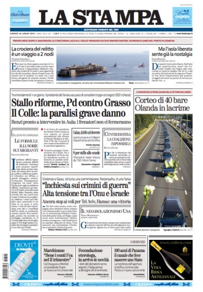 Due partenze lente sono protagoniste delle prime pagine di oggi: quelle dell’esame in aula della riforma del Senato e della Costa Concordia dall’isola del Giglio. Ma mentre la seconda era prevista, per il voto sugli emendamenti alla legge che dovrebbe modificare la composizione del Senato il governo avrebbe auspicato una maggiore velocità, e ieri sono arrivate le critiche del Pd al Presidente del Senato Grasso sulla gestione dell’iter parlamentare e l’intervento del Presidente della Repubblica Napolitano che si è lamentato della paralisi che recherebbe un grave danno all’attività parlamentare.