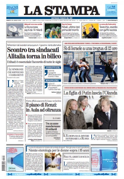 Le due notizie principali in apertura sui giornali di oggi sono l’allarme per l’accordo fra Alitalia e Etihad, messo a rischio dalla bassa partecipazione al referendum fra i lavoratori che dovevano approvarlo e dalle divisioni fra i sindacati, e la tregua di 12 ore a Gaza concessa da Israele, che ha invece respinto la proposta del segretario di stato USA Kerry di una pausa più lunga negli attacchi finché non saranno distrutti tutti i tunnel di collegamento con Israele. Qualche quotidiano si occupa invece ancora della riforma del Senato e della polemica di ieri fra Renzi e Grillo, fra colpi di stato e colpi di sole, mentre il Giornale apre con il testo della lettera inviata da Silvio Berlusconi ai leader dei partiti di centrodestra per favorire un riavvicinamento.