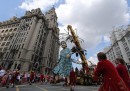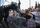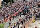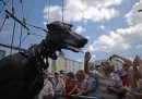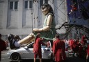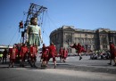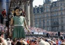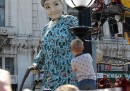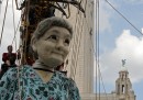 Da mercoledì 23 luglio, e fino a domenica 27, si sta svolgendo per alcune strade della zona del Merseyside a Liverpool, in Inghilterra, una parata organizzata e allestita dalla compagnia francese di teatro di strada “Royal de Luxe” in occasione del centenario dell’inizio della Prima Guerra Mondiale. Si tratta di una parata particolarmente notevole per via della presenza di alcune marionette giganti, alte più di 10 metri, trainate e controllate da decine di operai tramite appositi rimorchiatori e gru: lo spettacolo si chiama Memories of August 1914 e inscena il racconto di guerra fatto da una nonna (gigante) a sua nipote (gigante), e c’è pure il cane domestico (gigante). Marionette di simile statura si erano già viste a Liverpool anche nel 2012, quando la stessa compagnia allestì una parata intitolata Sea Odyssey, in occasione del centenario dell’affondamento del Titanic.