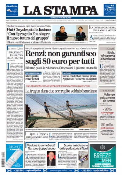 L’approvazione dell’articolo della riforma del Senato che prevede che saranno 100 i senatori che comporranno il nuovo Senato e le parole del Presidente del Consiglio Renzi, che non garantisce che il bonus di 80 euro possa essere esteso anche a altre categorie rispetto a quelle che lo hanno già ricevuto, sono l’apertura di tutti i giornali di oggi, ma sulle prime pagine molto spazio è dedicato anche alla tregua fra israeliani e palestinesi annunciata ieri e subito interrotta dopo la presunta cattura di un soldato israeliano da parte di Hamas.