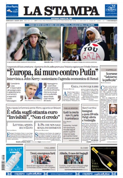 Le notizie in apertura sui giornali di oggi sono diverse: si va dalla tregua a Gaza, che regge mentre i soldati israeliani si ritirano dalla striscia di Gaza, ai dati previsti per oggi dell’ISTAT sul PIL, che potrebbe essere negativo, e alle preoccupazioni per i conti pubblici, alla polemica fra Renzi e Confcommercio sull’utilità del bonus di 80 euro, alla discussione della riforma del Senato, che dovrebbe avere una prima approvazione domani, alla protesta contro l’accordo con Etihad degli addetti ai bagagli di Alitalia a Fiumicino, mentre la Stampa intervista il Segretario di Stato americano Kerry che chiede sostegno all’Europa su Ucraina e Medio Oriente.