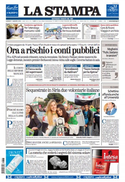 I giornali di oggi si occupano tutti in apertura dei dati comunicati ieri dall’ISTAT sul prodotto interno lordo nel secondo trimestre 2014, che è calato dello 0,2% rispetto al trimestre precedente, confermando la recessione per l’Italia come già previsto nei giorni scorsi. L’altra notizia presente su tutte le prime pagine è quella relativa alle due ragazze impegnate in Siria in un progetto umanitario delle quali non si hanno più notizie da sei giorni e che si teme possano essere state sequestrate.