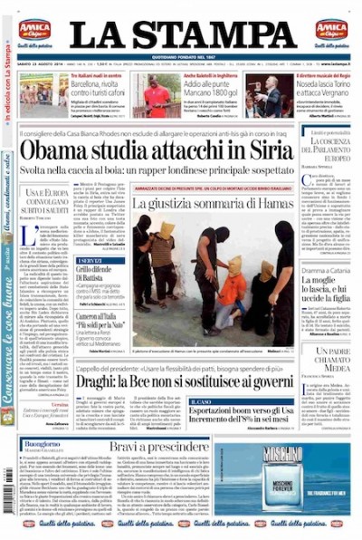 Le prime pagine dei giornali italiani più diffusi sono occupate principalmente da notizie di esteri: il Corriere della Sera apre con l’arrivo in Ucraina dei camion russi contenenti – a loro dire – aiuti umanitari, mentre La Stampa con un’indiscrezione secondo la quale il presidente degli Stati Uniti Barack Obama starebbe pensando di bombardare la Siria. Il Messaggero, invece, apre con un retroscena politico riguardo le prossime attività di Silvio Berlusconi, che secondo il giornale, fondamentalmente, continuerà a sostenere il governo guidato da Matteo Renzi. I quotidiani sportivi confinano la seconda medaglia d’oro di Gregorio Paltrinieri agli Europei di nuoto in boxini laterali, mentre discutono estesamente del possibile sostituto di Mario Balotelli e del Trofeo Tim, un triangolare amichevole fra Juventus, Milan e Sassuolo che si giocherà stasera.